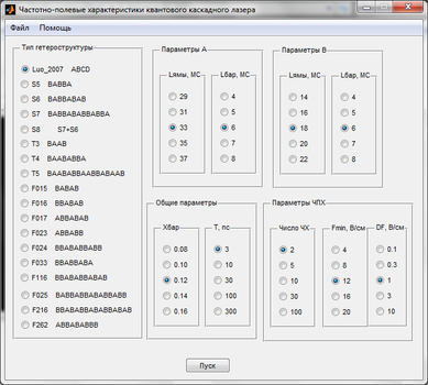 Если тип гетероструктуры выбрать «Luo_2007, то получаем ЧПХ эталонной трехъямной квантовокаскадной структуры … при следующих значениях остальных параметров….