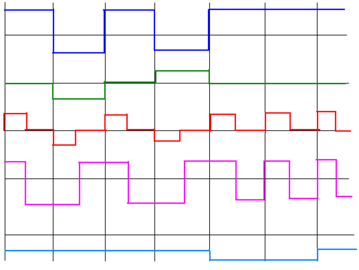 2) биполярное кодирование с альтернативной инверсией единиц. Три состояния. Ноль – нулевой потенциал, единица – положительным или отрицательным, причём каждая последующая – инверсным. Частично решает проблему низкочастотной составляющей и рассихронизации. Остаётся опасность длительной последовательности нулей. Поскольку для каждой единицы нужен инверсный потенциал, то при приходе двух единиц одной полярности становится понятно, что где-то ошибка.