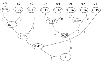 Построение неравномерного кода, длина кодовой комбинации определяется вероятностью (частотой) его появления в сообщении. Реализует построение кодового дерева: задаётся последовательность символов