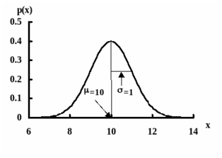 Рис. 3. Функция нормального распределения случайной величины x с параметрами =10 и =1.