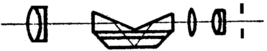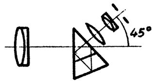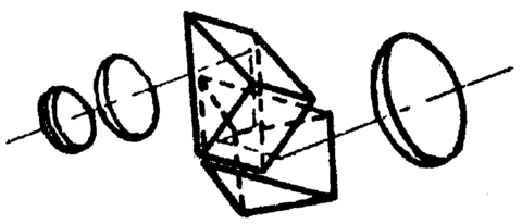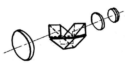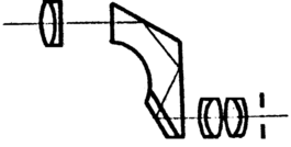 Рассмотрим схемы некоторых призменных монокуляров. Призма Шмидта (рис. 1) позволяет иметь в монокуляре угловое поле не более 8° и образует угол отклонения в 45° между визирной осью (оптической осью в пространстве предметов) и оптической осью окуляра. Монокуляр с призмой Аббе (рис. 2) иногда используется для изготовления призматических биноклей. Призма Пехана (рис. 3) позволяет получить компактную вдоль оси оптическую систему благодаря большой длине хода лучей внутри призмы. Если наблюдательный прибор должен иметь повышенные пластичность и компактность, то следует применять в схеме призму Лемана (рис. 4).