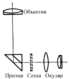 стественно, что для наблюдения за удаленным объектом необходима телескопическая система, состоящий как минимум из объектива и окуляра. Для согласования направления на объект и горизонтального расположения зрительной оси оператора необходима отражательная призма с углом отклонения 90°. А так как изображение должно быть прямым (важно правильно оценивать направление перемещений вертолета), призму снабжают крышей.Таким образом, оптической схемой прибора является схема призменного монокуляра, состоящая из объектива, прямоугольной крышеобразной призмы и окуляра (см. рис. 8).