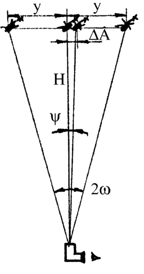 Угловой предел разрешения ' определим исходя из указаний о необходимости иметь впечатление от изображения минимального отклонения не хуже, чем от миллиметровых делений, т.е. '=1/250=0,004 или '=13,3', где 250 мм – расстояние наилучшего зрения. Угловой предел разрешения в пространстве предметов (см. рис. 8) равен =А/Н, где А – минимальное горизонтальное отклонение, равное 3 м, Н – высота полета, т.е.=3/3000=0,001 или =3,3' *).