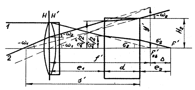 Определим расстояние e1 от задней главной плоскости объектива до призмы: