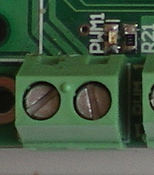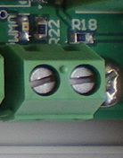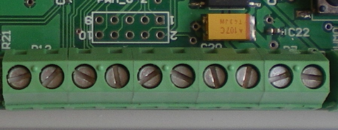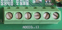 На плате предусмотрено два входа для инкрементных энкодеров. Входы идеально подходят для энкодеров типа ENA1J-B28 фирмы Bourns (http://www.bourns.com/) . Эти энкодеры имеют 3 канала: A, B, N. По этим каналам приходят импульсы от энкодера, когда он вращается. Процессор подсчитывает импульсы и определяет положение вала энкодера. На плате входы оформлен, как 10 клемм (по 5 на энкодер). На рисунке 2.6.1 показан клеммник и первая клемма в нём.