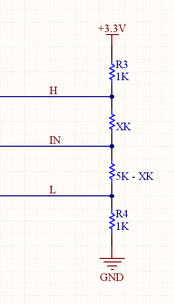 Данная схема, представляет собой, делитель с переменным параметром Х. Значение Х зависит от угла поворота потенциометра. При изменении угла, будет изменяться значение Х. При изменении значения сопротивления, изменится напряжение в точке IN, которая подключена к входу АЦП процессора, следовательно, изменится значение в регистре АЦП.