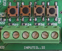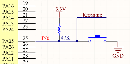 По-умолчанию на ножку процессора подаётся 3.3V (через резистор) т.е. в регистре установлены логические единицы. При нажатии на кнопку, ножка процессора замыкается с землёй, и в регистре микропроцессора устанавливается логический 0. В таблице 2.2.1 приведено соответствие клемм в клемнике INPUNT[0..3] и ножек процессора.