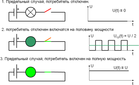 Потребитель то подключается к источнику энергии (батарее) то отключается. Подключение и отключение происходят с большой частотой (кГц). Длительность подключения (скважность) изменяется, и изменяется среднее напряжение на потребителе. Таким образом, изменяя скважность можно изменять напряжение. Такой метод регулирования самый экономичный из возможных (практически нет потерь на ключе) и широко применяется в управлении техническими системами.