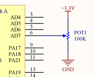 На плате установлено два потенциометра, подключённых к АЦП (рис. 2.4.1). Схема подключения потенциометра к процессору приведена на рисунке 2.4.2. В таблице 2.4.1 приведено соответствие между ножкам процессора и потенциометрами.