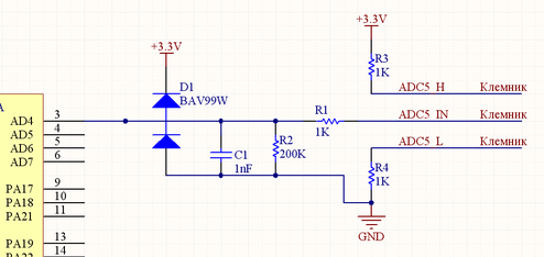 АЦП служит для определения значения напряжения на ножке процессора. Упрощённо АЦП напоминает вольтметр. Внутри процессора входу АЦП соответствует регистр, в который сохраняется значение напряжения. Значение напряжения в регистре сохраняется не в вольтах, а в частях от 3.3 вольт. Числу 1023 в регистре соответствует напряжение на входе АЦП в 3.3 вольта. Ноль в регистре – ноль на ножке процессора. 512 (1024 / 2) в регистре соответствует 1.75 вольта (3.3 / 2). Получается линейная зависимость между напряжением на ножке процессора и числом в регистре. Этот регистр можно считать и ввести значение в пользовательскую программу. Два входа АЦП выведены в клеммник ADC[0..1]. На рисунке 2.3.1 приведёна фотография клеммника и отмечена первая клемма. Схема входного канала АЦП рис 2.3.2.
