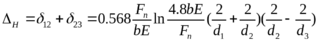 На рис. 2 схематично показаны деформации, возникающие на охватывающем кольце от приложенных нормальных сил Fn. Контактные деформации ΔН составляются из деформаций рабочих поверхностей ведущего вала и сателлита δ12 , а также деформаций поверхностей сателлита и охватывающего кольца δ23. Величина ΔН может быть найдена по формуле: