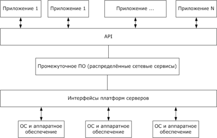 Промежуточное ПО охватывает все платформы клиентов и сервером и отвечает за маршрутизацию запросов клиентов к соответствующему серверу. Скрывает отличия протоколов взаимодействия и отличия разных ОС. Сервер приложений должен базироваться на мощной аппаратной платформе, также предъявляются особые требования к ОС, которая должна быть установлена на нём.