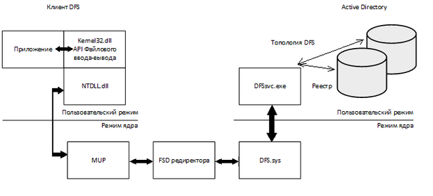 Ha клиентской стороне поддержка DFS реализована в драйвере MUP и использует редиректор CIFS для взаимодействия с серверами DFS на внутреннем уровне. Провайдер клиента DFS реализован в \Windows\System32\Ntlanman.dll. Когда клиент выдает запрос на ввод-вывод для файла в пространстве имен DFS, драйвер MUP на клиентской стороне взаимодействует с сервером, на котором находится этот файл, через подходящий редиректор.