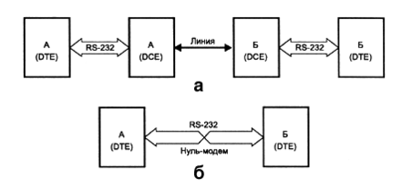 Интерфейс RS-232C предназначен для подключения аппаратуры, передающей или принимающей данные к оконечной аппаратуре каналов данных. В роли аппаратуры передачи данных может выступать компьютер, принтер, плоттер и другое периферийное оборудование. Этой аппаратуре соответствует аббревиатура DTE - Data Terminal Equipment. В роли аппаратуры каналов данных обычно выступает модем. Этой аппаратуре соответствует аббревиатура DCE - Data Communication Equipment. Конечной целью подключения является соединение двух устройств DTE, полная схема соединения приведена на рис. 1а. Интерфейс позволяет исключить канал удаленной связи вместе с парой устройств DCE (модемов), соединив устройства непосредственно с помощью нуль-модемного кабеля (рис. 1б.).