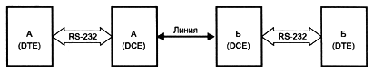 Интерфейс RS-232 предназначен для подключения аппаратуры, передающей или принимающей данные к оконечной аппаратуре каналов данных. В роли аппаратуры передачи данных может выступать компьютер, принтер, плоттер и другое периферийное оборудование. Этой аппаратуре соответствует аббревиатура DTE - Data Terminal Equipment. В роли аппаратуры каналов данных обычно выступает модем. Этой аппаратуре соответствует аббревиатура DCE - Data Communication Equipment. Конечной целью подключения является соединение двух устройств DTE (рисунок 1).