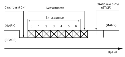 Передача каждого байта начинается со старт-бита, сигнализирующего приемнику о начале посылки, за которым следуют биты данных и, возможно, бит четности (Parity). Завершает посылку стоп-бит, гарантирующий паузу между посылками.