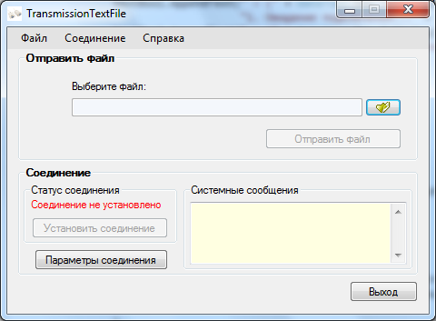 Позволяет войти в меню, соединить/разорвать соединение, выбрать и послать файл. На фоме отображается статус соединения и системные сообщения.