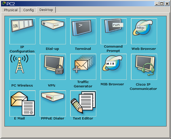 Третья вкладка сетевых устройств обеспечивает доступ к командной строке операционной системы IOS, с которой мы познакомимся подробнее на следующих лабораторных работах. Третья вкладка рабочих станций и серверов содержит интерфейсы доступа к различным сетевым параметрам, а также несколько клиентских приложений. (рис. 6.)