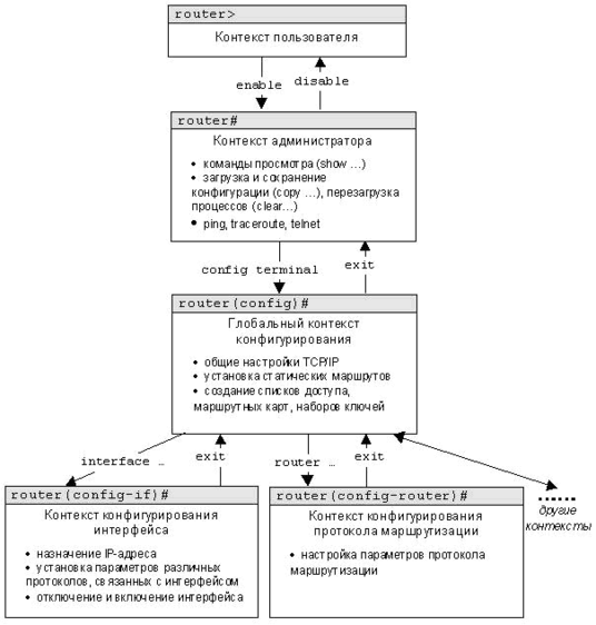При работе в командной строке Cisco IOS существует несколько контекстов (режимов ввода команд).