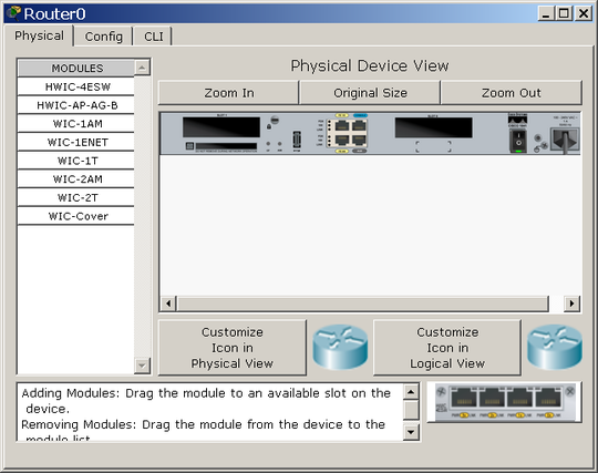 Каждое устройство в программном продукте Cisco Packet Tracer может быть сконфигурировано через окно свойств, которое вызывается по двойному клику на устройстве. Первая вкладка отвечает за физические параметры устройства. В маршрутизаторы и коммутаторы можно добавлять новые модули, в рабочие станции и серверы — вставлять сетевые адаптеры. Для того чтобы переконфигурировать устройство, необходимо предварительно его выключить, нажав на кнопку отключения питания на физическом изображении устройства (рис. 4).