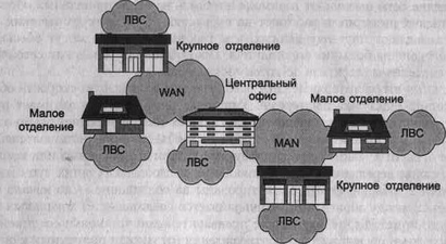 Классификация сетей – Сети часто условно делят на три большие категории: глобальные сети (WAN, Vide Area Network), городские сети (MAN, Metropolitan Area Network) и локальные сети (LAN, Local Area Network). В нашей стране локальные сети распространены гораздо больше, чем городские или глобальные. Традиционное русское сокращение для локальных сетей — ЛВС (локальная вычислительная сеть).