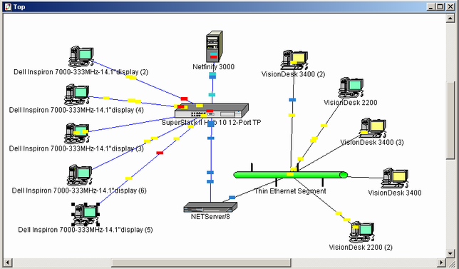 Для объединения рабочих станций в сегмент вам необходим концентратор. Найдите модель SuperStack II Hub 10 12-Port TP в разделе Hubs/Shared Media/Ethernet/3Com Corp. Переместите его на рабочую область: