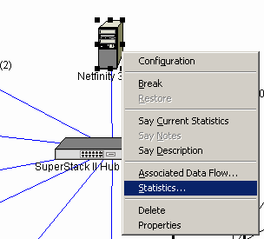 Далее выведем статистику: для сервера - текущую нагрузку (current workload) и количество полученных пакетов; для сегмента 10BASE-2 - процент использования (average utilization). Это можно следующим образом: щелкнув правой клавишей мыши по серверу и вызвав контекстное меню, выберите пункт Statistics:
