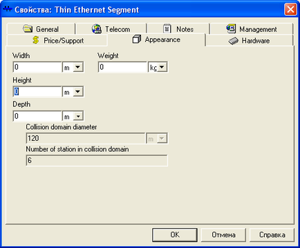 В окне свойств сетевого устройства, например, сегмента Thin Ethernet Segment, которое откроется при выборе в контекстном меню опции Properties, можно выбрать закладку Appearance и узнать диаметр домена коллизий и число устройств в этом домене.