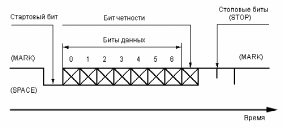 Из рисунка видно, что исходное состояние линии последовательной передачи данных – уровень логической 1. Это состояние линии называют отмеченным – MARK. Когда начинается передача данных, уровень линии переходит в 0. Это состояние линии называют пустым – SPACE. Если линия находится в таком состоянии больше определенного времени, считается, что линия перешла в состояние разрыва связи – BREAK.