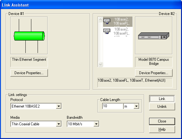 Подключим к мосту сегменты 10Base-T и 10Base-2 с помощью кнопки Link Assistant