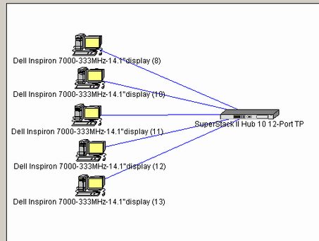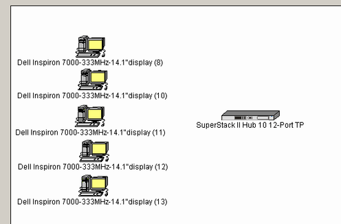 Для объединения рабочих станций в сегмент вам необходим концентратор. Найдите модель SuperStack II Hub 10 12-Port TP в разделе Hubs/Shared Media/Ethernet/3Com Corp. Переместите его на рабочую область:
