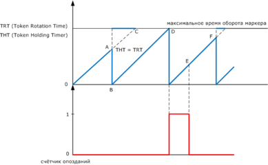 Событие E: пришёл маркер, но он опоздал (счётчик стоит в 1), станция не может захватить кольцо, но так как маркер пришёл, то по этому времени сбрасывается счётчик опозданий, а TRT продолжает считать.
