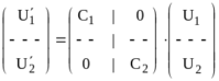 Для элемента, содержащего несколько узлов, связь между вектором узловых перемещений U в глобальной системе осей координат и вектором узловых перемещений U` в локальной системе осей координат осуществляется при помощи квазидиагональной матрицы направляющих косинусов C(e) элемента, составленной из матриц направляющих косинусов входящих в элемент узлов: