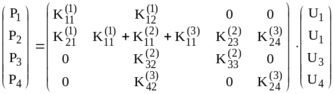 Отсюда видно, что в уравнение равновесия для узла входят компоненты матриц жесткости только тех элементов, которые примыкают к этому узлу. Кроме того, в это уравнение входят перемещения только тех узлов, которые принадлежат элементам, примыкающим к рассматриваемому узлу.