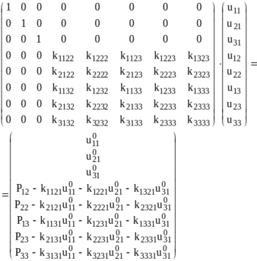 Поскольку узел 1 закреплен от смещений, все три его перемещения равны нулю. Следовательно, уравнения равновесия первого узла в данной системе (они выражаются матричным равенством