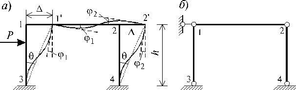 В качестве другого примера, рассмотрим раму, изображенную на рис.8.4, a, число жестких узлов которого равно 2. Следовательно, nθ = 2.