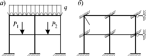 Получаемая в результате система, называется основной системой метода перемещений. Например, для расчета заданной системы, изображенной на рис.8.6, a по методу перемещений основная система будет иметь вид, представленный на рис.8.6, б. При этом nkin = nθ + nΔ = 6 + 2 = 8.