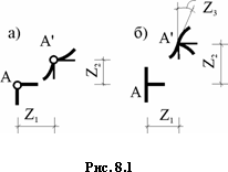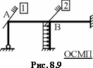 Рис. 8.5,б: nθ = 2 (узлы А и В); nΔ = W = 2 · 2 − 1 − 3 = 0 (узлы шарнирной схемы 1 и 2; стержень, соединяющий эти узлы 12, опорные связи 11′, 22′, 22′′); nkin = 2 + 0 = 2.