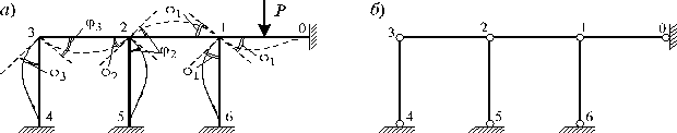 На основании о пренебрежении продольными деформациями элементов, для плоской рамы (рис.8.1, а), линейные смещения узлов отсутствуют. При этом, шарнирная схема (рис.8.2, б) является геометрически неизменяемой.