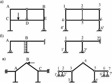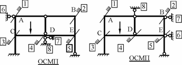 Рис. 8.5,а: nθ = 5, так как рама имеет пять жестких узлов (А, B, C, D, E); nΔ = W = 2Y − C − Co = 2 · 6 − 7 − 2 = 3 (узлы шарнирной схемы 1 – 6; стержни, соединяющие эти узлы: 12, 23, 45, 56, 14, 25, 36; опорные связи 44′, 66′); nkin = nθ +nΔ = 5 + 3 = 8.