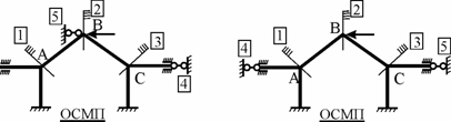Рис. 8.5,в: nθ = 3 (узлы А, В, С); nΔ = W = 2 · 7 − 6 − 6 = 2 (узлы шарнирной схемы 1 – 7; стержни, соединяющие эти узлы 12, 23, 34, 45, 56, 67; опорные связи 11′, 22′, 33′, 55′, 66′, 77′); nkin = = 3 + 2 = 5.