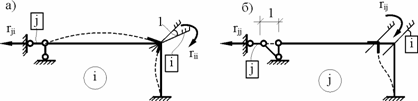 Рассмотрим i-е исходное состояние основной системы метода перемещений, в котором i-я наложенная связь получила перемещение на величину, равную единице, и определим реакцию в j-й наложенной связи rji от этого перемещения (рис. 8.14,а). За возможные примем перемещения в j-м состоянии основной системы (рис. 8.14,б). Суммарная возможная работа внешних (Wext,ij) и внутренних (Wint,ij) сил i-го состояния на возможных перемещениях, имеющих место в j-м состоянии, в силу равновесия рассматриваемой системы равна нулю