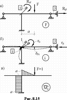 Для определения реакций в наложенных связях от заданной нагрузки RiF воспользуемся теоремой о взаимности возможных работ состояний F и i, изображенных на рис. 8.15,а,б.