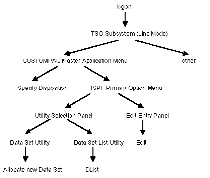 Подсистема ISPF построена как иерархическое меню, позволяющее вызывать различные функции TSO, вводя команды в командной строке. Операционная система z/OS управляет многими подсистемами. Иерархическая взаимосвязь подсистем и функций, которые вы будете осваивать, показана на рисунке 7. Для того, чтобы перейти к выбранному пункту меню, введите его номер в командной строке. Если вам нужно перейти сразу на несколько уровней меню вниз, вы можете ввести номера пунктов, разделенные точкой. Так, введя «3.2» в главном меню ISPF (Рис. 6), вы попадете в утилиту Data Set из меню Utilites. Чтобы вернуться назад из подменю или утилиты, нажмите F3.