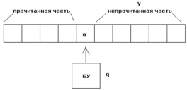 Конфигурация конечного автомата – упорядоченная пара (q,ay), где q – текущее состояние блока управления, a – текущий символ в обозреваемой ячейке, y – часть цепочки, находящаяся на ленте правее наблюдаемой ячейки. Цепочку ay называют непрочитанной частью входной цепочки. Если она пустая, то её считают равной .