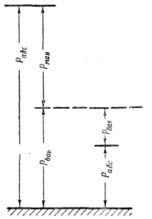 Если условно отметить уровень нулевого давления и от него отложить барометрическое (атмосферное) и манометрическое давления, то получим схему, показанную на рис. 3. Давление атмосферного воздуха переменно, поэтому его уровень отмечен пунктирной линией.