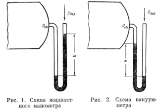 с U-образной трубкой, в которой находится жидкость. При открытом сосуде давление внутри него равно атмосферному (барометрическому) давлению. Если сосуд закрыть и увеличить в нем давление, то часть жидкости из левого колена U-образной трубки будет вытеснена в правое, вследствие чего образуется разность Уровней. Давление в сосуде, так называемое абсолютное давление Рабс будет уравновешиваться давлением атмосферы рбар, измеряемым барометром и давлением столба жидкости высотой Н, называемым избыточным давлением ризб Таким образом,