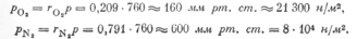 Пример 1. Воздух по объему состоит из 20,9% кислорода и 79,1% азота. Определить парциальные давления кислорода и азота при давлении смеси 760 мм рт. ст. Состав воздуха взять по массе.