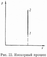 Изохорный процесс (v = cont). В координатах р — v этот процесс представится прямой, параллельной оси ординат (рис. 22). Очевидно, уравнением процесса явится зависимость