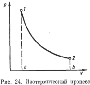Изотермический процесс (Т — const). В координатах р — v этот процесс представится известной кривой Мариотта (рис. 24), а его уравнением будет уравнение закона Бойля — Мариотта: